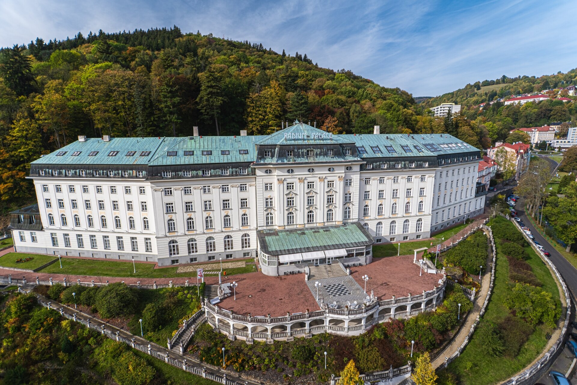 Das Kurhotel RADIUM PALACE befindet sich inmitten eines großen Waldparks und wirkt im Grün der Bäume wie eine schöne Perlenkette. Das Gebäude des Radium Palace wurde 1912 auf Initiative der Wiener Aktiengesellschaft unter der Führung von Graf Arnošt Tarrouc auf dem Gelände des ursprünglichen Gasthauses erbaut. Zu seiner Zeit war das Radium Palace eines der modernsten Kurhotels in Mitteleuropa. Das Kurhotel tut alles dafür, das hohe Hotelniveau bis heute zu halten.