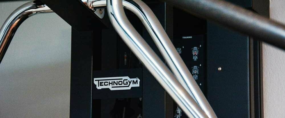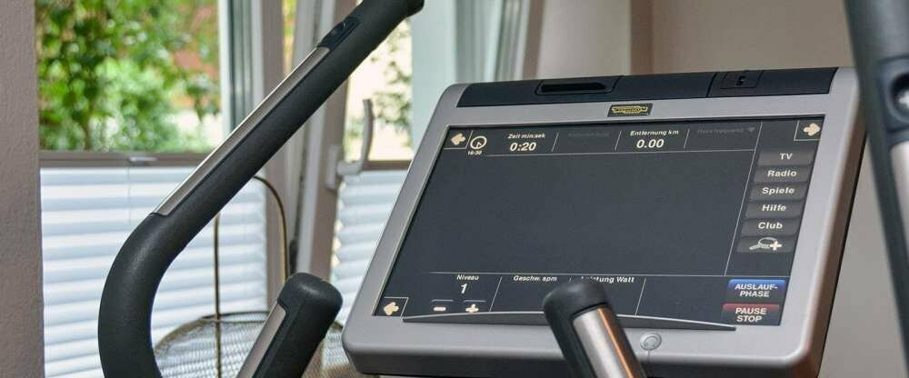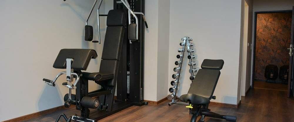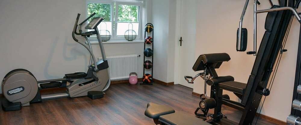 - Q! Sportbereich mit TechnoGym Crosstrainer, Multifunktionsgerät und Hantelbank mit Gewichten