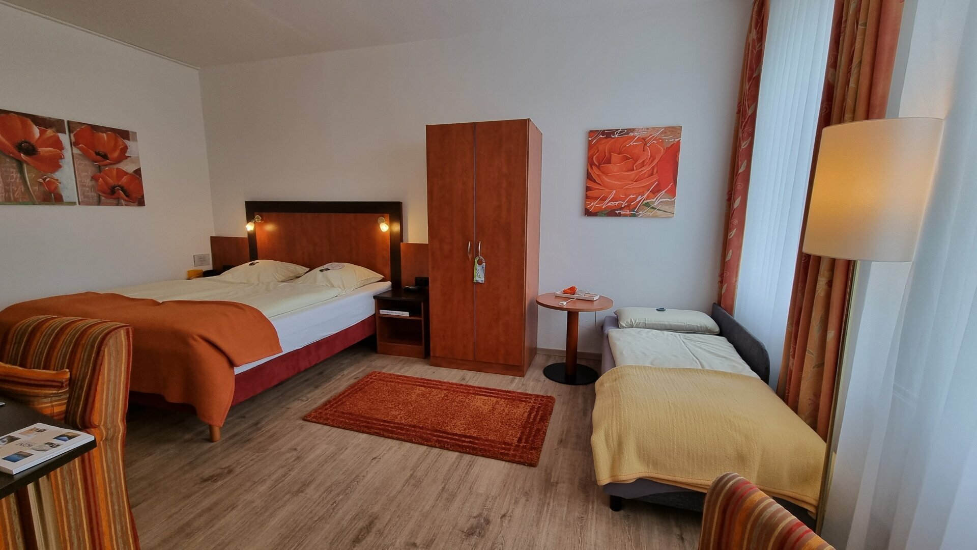 kleines Doppelzimmer mit einem Bett 140x200cm Genießen Sie Ihren Aufenthalt in kleinen Nichtraucher-Doppelzimmern. Die Badezimmer sind ausgestattet mit Dusche oder Badewanne und WC sowie Haartrockner. Ebenfalls bieten die Zimmer kotenloses W-Lan, Flachbildfernseher, Radiowecker, Safe sowie eine Minibar.
