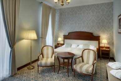 20 großzügige und luxuriös ausgestattete Doppelzimmer mit hochwertiger Einrichtung und Blick auf den Spa-Park und die Kolonnade Schlafzimmer mit Queensize- oder Twin-Doppelbett, Nachttischen mit Nachtlicht, Kleiderschrank, Schreibtisch, Sitzbereich mit Stühlen und Beistelltisch, Wandspiegel, LED-TV (Satelliten-TV), iPod Docking-Station, Radiowecker, Telefon, Kühlschrank mit Minibar, Zimmersafe, Tee- und Kaffeezubereitungsmöglichkeiten, Bügelbrett und Bügeleisen, individuell einstellbarer Klimaanlage/Heizung und WLAN En-suite-Badezimmer mit Badewanne/Dusche oder Dusche, WC, Bidet, Waschbecken, Wand- und Kosmetikspiegel, Haartrockner, Telefon, Spa-Handtüchern, Bademantel, Frottee-Slippern und kostenlosen Pflegeprodukten Zustellbett auf Anfrage möglich. Alle Zimmer dieser Kategorie verfügen über einen Balkon oder eine Terrasse.